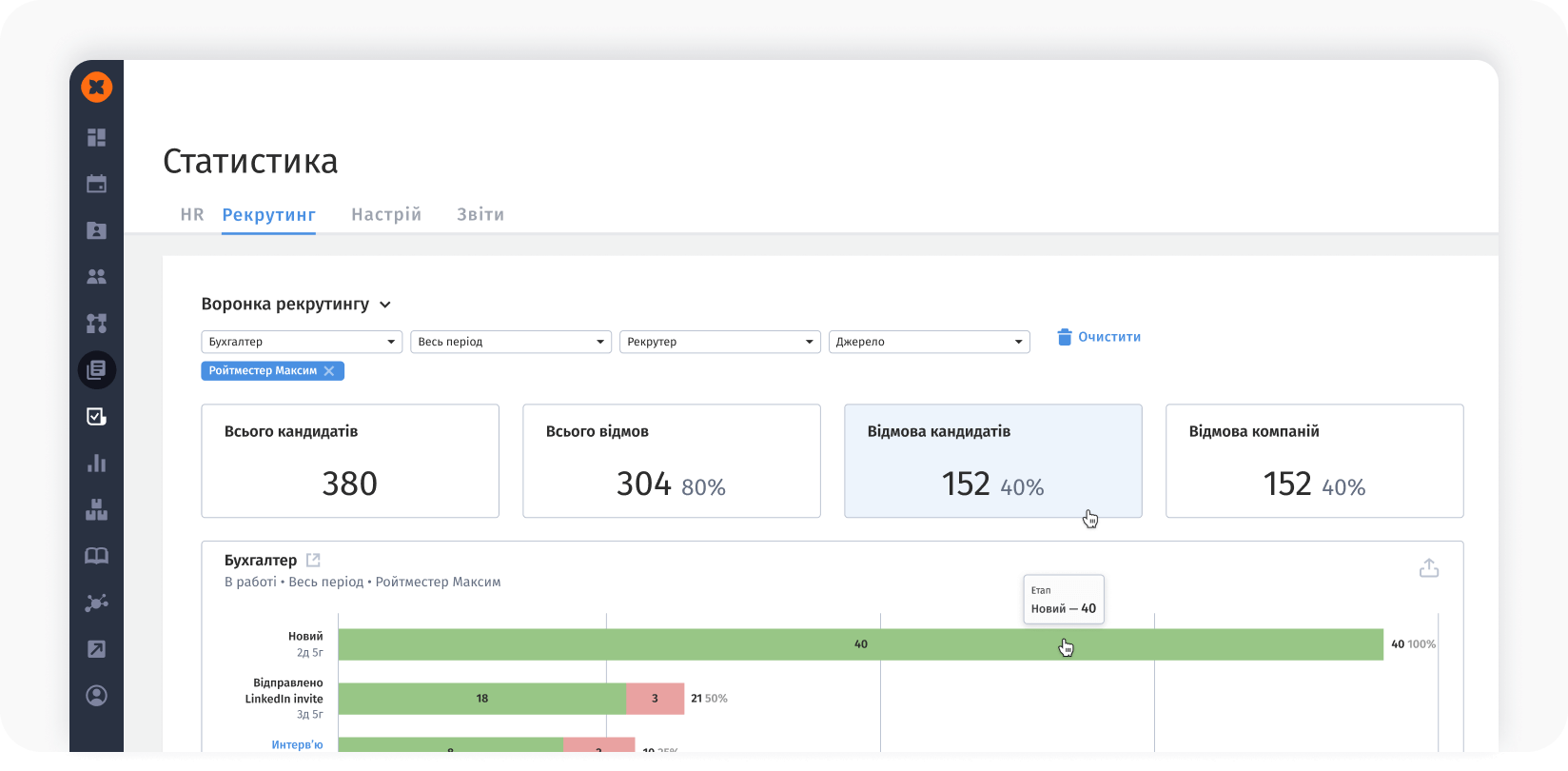 Результати: скорочення часу на підбір, підвищення прозорості між департаментами, оцінка ефективності кожного рекрутера на основі даних.