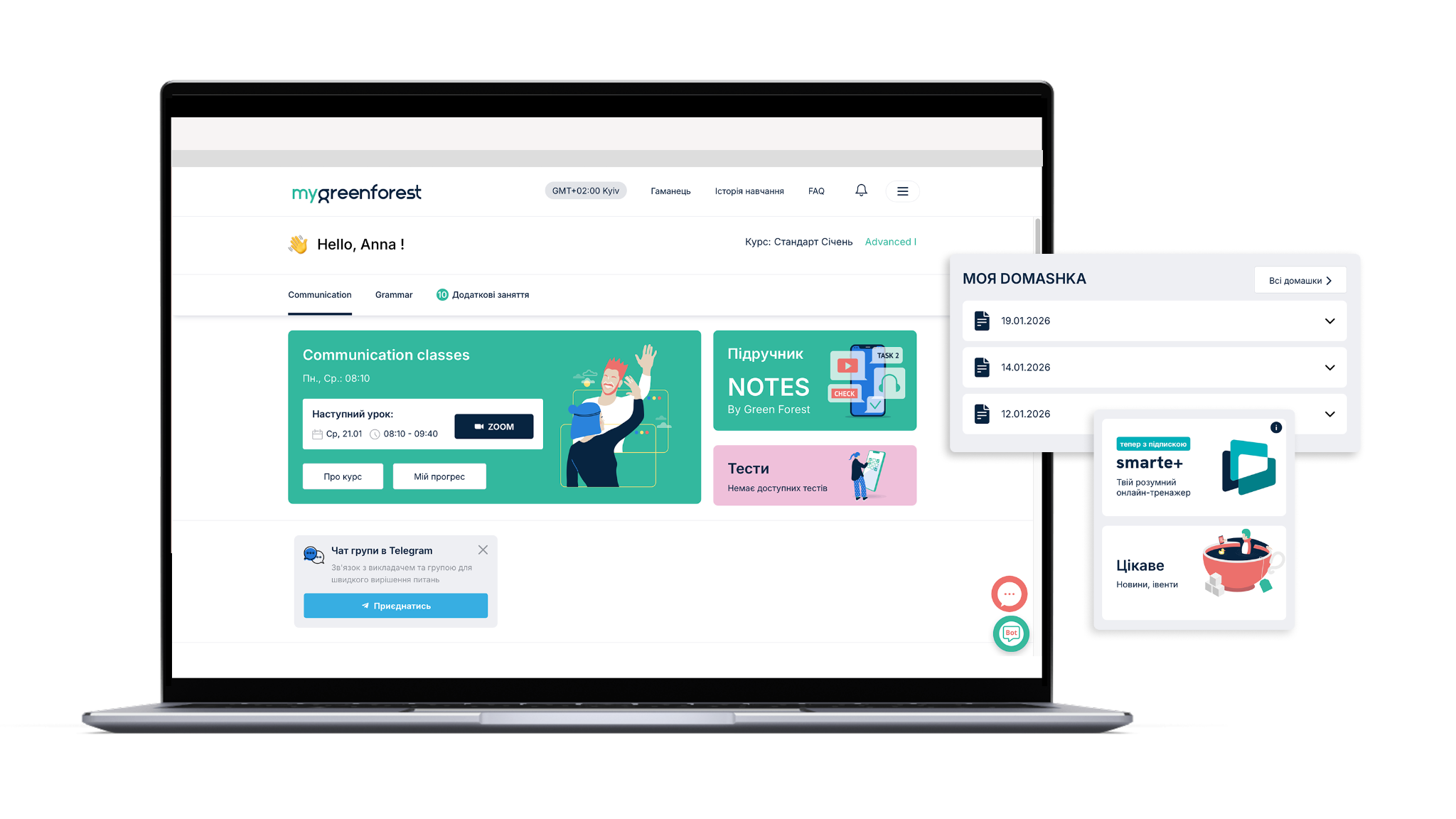 Замість громіздких роздруківок студенти використовують інтерактивний підручник Notes by Green Forest, який працює з будь-якого гаджета. Повторити лексику в транспорті, повернутися до теми після пропуску заняття — все це можна зробити без зайвих зусиль.
