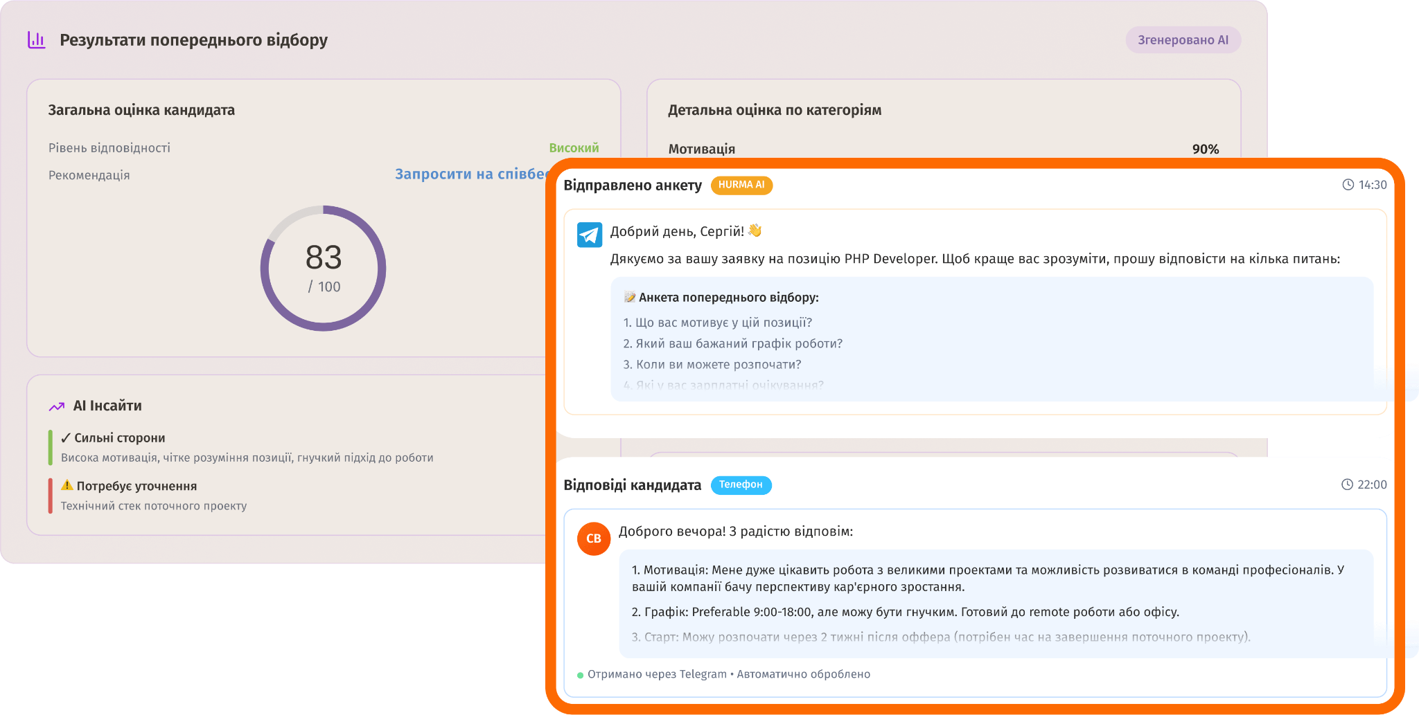 HURMA AI навчається на внутрішніх процесах компанії і допомагає закривати критичні точки, де рекрутери найчастіше втрачають кандидатів: