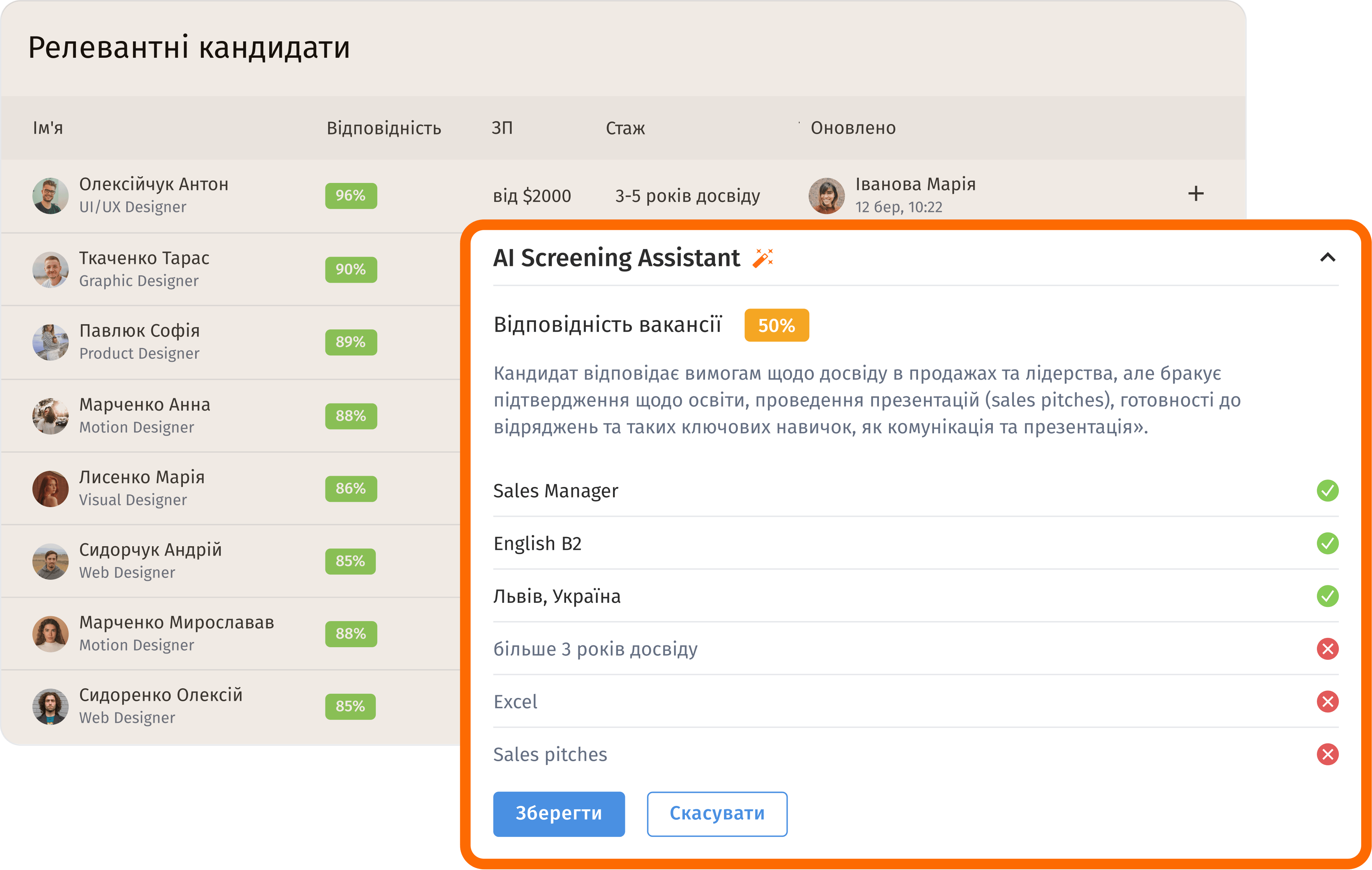 Автоматизує первинний скринінг і ранжування кандидатів за вашими критеріями