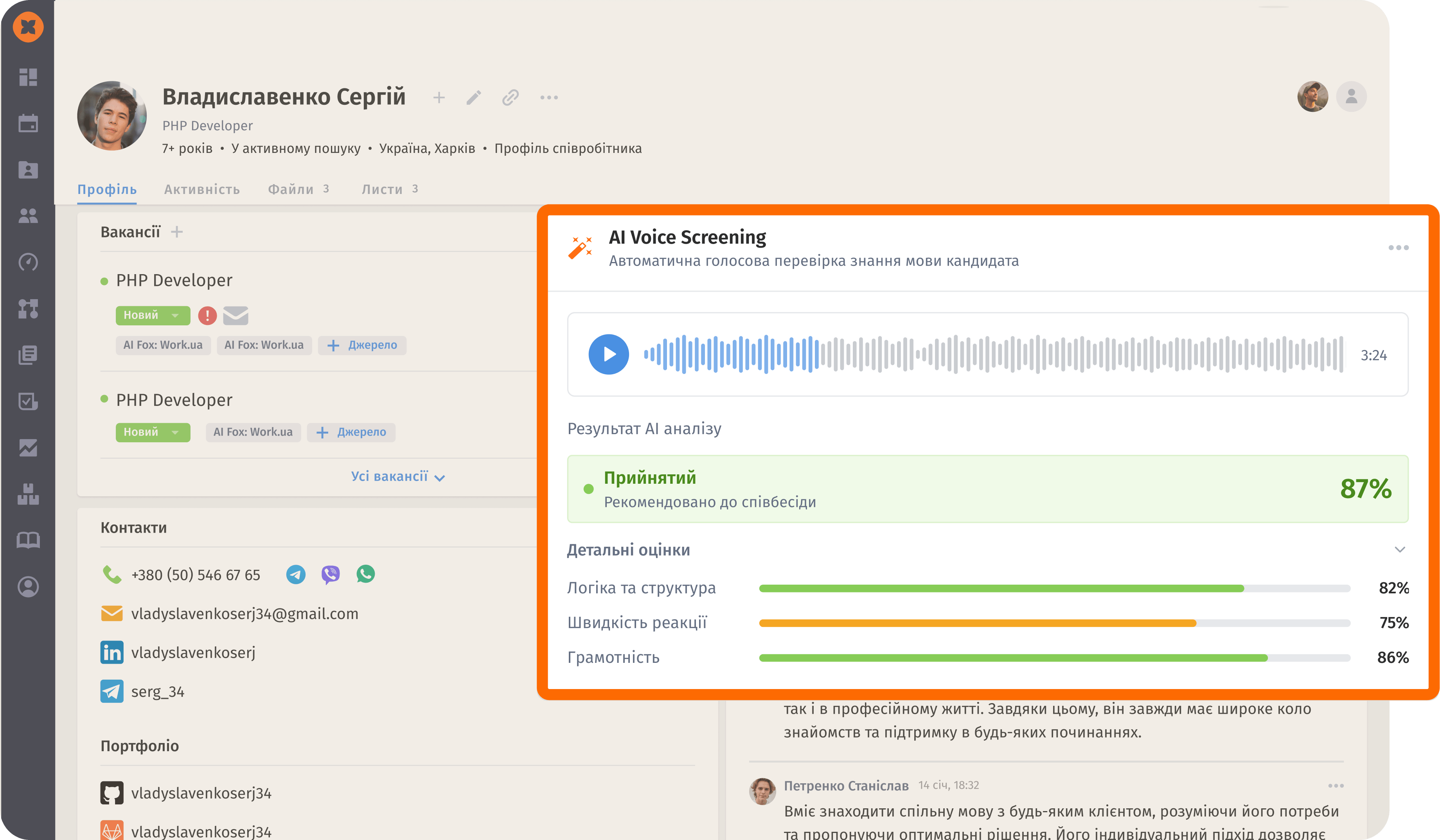 HURMA AI робить голосову перевірку ще до співбесіди: кандидат записує коротке повідомлення, а система оцінює рівень і показує підсумок “проходить / сумнівно / не підходить”. Ви витрачаєте час на співбесіди лише тоді, коли базовий поріг уже підтверджено.
